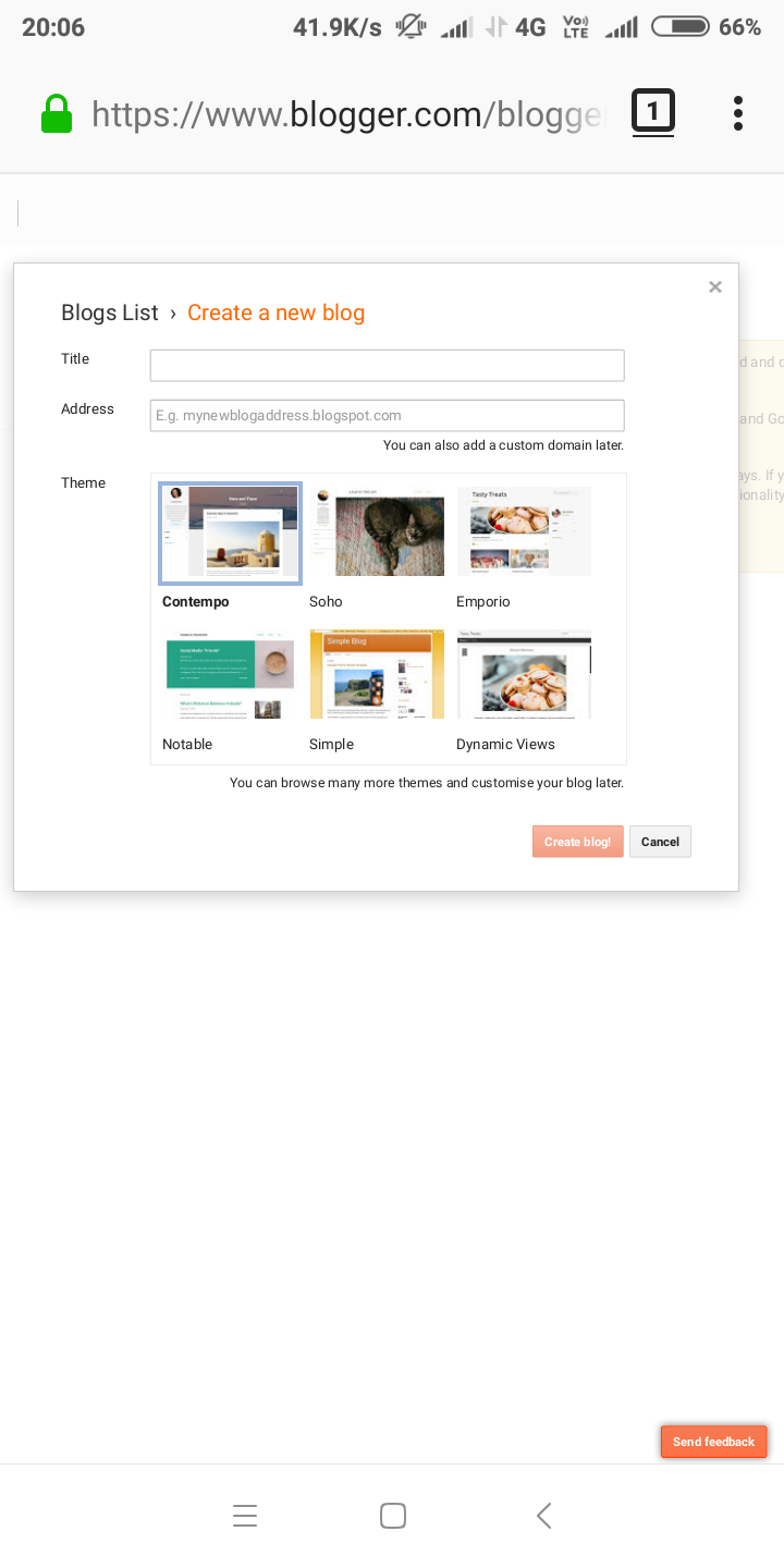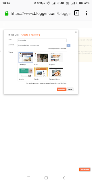 अब आप नीचे दिए गए विकल्प create blog पर क्लिक करें। अब आपका ब्लॉग बन चुका है। अब आपको अपने ब्लॉग में थीम इंस्टाल करना होगा। एक बात और आपको बता दें। कि ब्लॉगर डॉट कॉम पर आपको फ्री में ब्लॉग बनाने की सुविधा मिलती है। इसलिए ब्लॉगर आपके ब्लॉग में अपना नाम देता है। यानी आपका ब्लॉग सब डोमेन के नाम पर होता है। जैसे hindipatrika2018.com की जगह आपको hindipatrika2018.blogspot.com  का नाम मिलता है। यदि आप किसी डोमेन रजिस्टार से डोमेन खरीदते है। तो आपको hindipatrika2018.com का नाम मिल जाएगा। यानि कि आपके ब्लॉग के डोमेन से ब्लॉग्स्पॉट हटा दिया जाएगा। यदि आप कोई नया डोमेन खरीदते है। तो इसके लिए आपको कुछ पैसे खर्च करने पड़ेंगे। इसके लिए आपको बहुत अधिक पैसे नही खर्च करने पड़ते है। यदि आप godady से डॉमेन्ट खरीदते है। तो आपको 199 रुपये के आसपास खर्च करने पड़ते है। जिसकी वैधता 1 वर्ष की होती है। अभी तक आपने सीखा कि ब्लॉग क्या होता है। और ब्लॉगर डॉट कॉम पर फ्री में एक ब्लॉग कैसे बनाते है। यदि ब्लॉग से सम्बंधित कोई प्रश्न है। तो आप कॉमेंट बॉक्स में अपने प्रश्न लिखकर पूछ सकते है ।आपके प्रश्ननो का अतिशीघ्र जबाब दिया जाएगा।