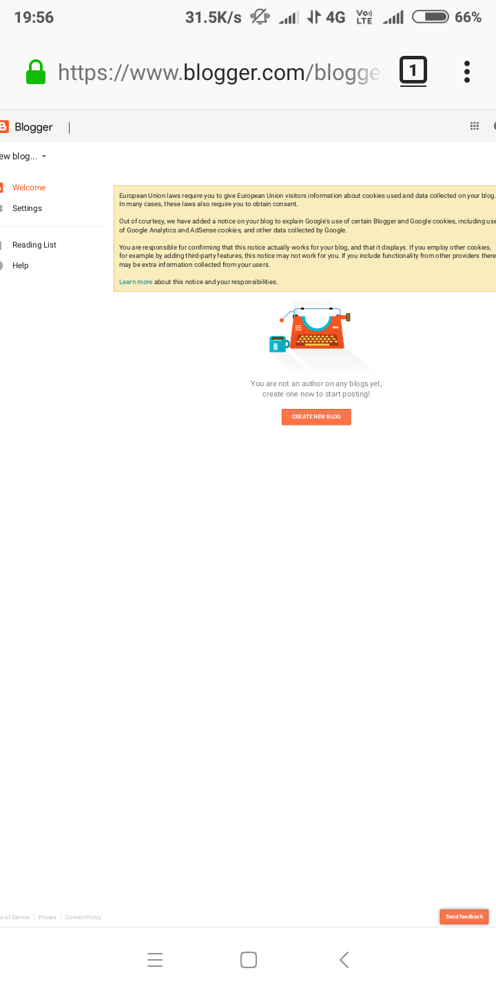 यहां आने के बाद आप आसानी से अपना ब्लॉग बना सकते है। इसके लिए आपके पास एक जीमेल एकॉउंट होना चाहिए। ब्लॉग बनाने के लिए आपको साइन इन पर क्लिक करना होगा। अब आपसे आपका जीमेल एकॉउंट पूछा जाएगा। जीमेल एकॉउंट वाले बॉक्स में अपना जीमेल एकॉउंट भरें। इसके बाद नेक्स्ट बटन पर क्लिक करें। अब आपसे आपके जीमेल एकॉउंट का पासवर्ड पूछा जाएगा। उस पासवर्ड को दिए गए पासवर्ड वाले बॉक्स में भरें। इसके बाद आपको नेक्स्ट बटन पर क्लिक करना है। अब आप ब्लॉग के होम पेज पर पहुच चुके है। यहां से आपको आपका ब्लाग बनाने का अधिकार मिल जाएगा। इस ब्लॉगर के वेलकम पेज पर आप आ चुके है। यहां आप क्रिएट ए ब्लॉग पर क्लिक करें।