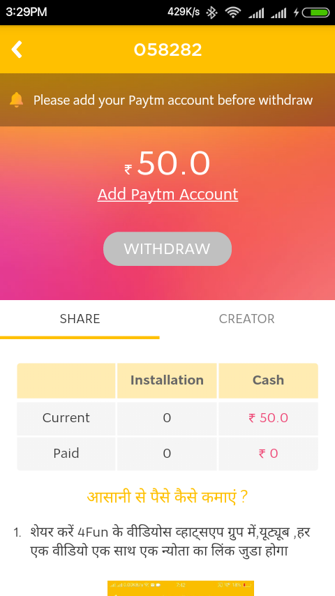 जैसे ही आप अपना मोबाइल नंबर डालकर ओके बटन दबाएंगे। तो आपके मोबाइल नम्बर पर एक ओटीपी का मैसेज जाएगा। इस ओटीपी को आप टाइप करके इस एप में लॉगिन हो सकते है। जैसे ही आप लॉगिन होंगे। आपके एकाउंट में 50 रुपये तुरन्त मिल जाते है। आप ऊपर के चित्र में देख सकते है। इसके बाद आपको वीडियो शेयर करते रहना है। एक शेयर का आपको 1 रुपया तुरन्त मिल जाता है। इस शेयर किए गए वीडियो में एक लिंक भी जाता है। यदि कोई इस लिंक पर क्लिक करके इस एप को डाउनलोड करता है। तो आपको 7 रुपये मिल जाते है। अब सोच सकते है। एक दिन में आप कुछ घंटे खर्च करके अपने स्मार्टफोन से कितना पैसा कमा सकते है। इस एप को लिंक से ही डाउनलोड करें। तभी 50 रुपये मिलेंगे। अपने सवाल आप कॉमेंट बॉक्स में पूछ सकते है। यहां से डाउनलोड करें। 4FUN