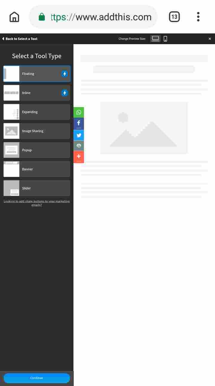 Step2- जब आप ad new tool पर click करेंगे। तो आपके सामने नीचे दिए गए चित्र के अनुसार page खुल जाएगा। आप इस page में देख सकते है। कि floating share button दिखाई दे रहा है। इसमें 5 button रहते है। अपनी जरूरत के अनुसार आप और button add कर सकते है। इस page में आप सबसे नीचे activate button पर click करें। जब यह tool activate हो जाएगा। तो ऊपर दिए गए चित्र के अनुसार दिखाई देगा। ऊपर 2 tool active है।