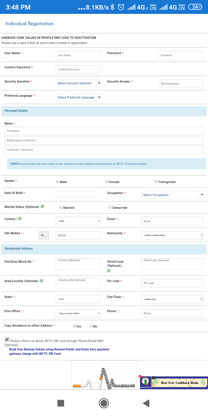 irctc par registration kaise kare के फॉर्म में दिए गए यह सभी ऑप्शन को एक-एक करके भरना होगा |